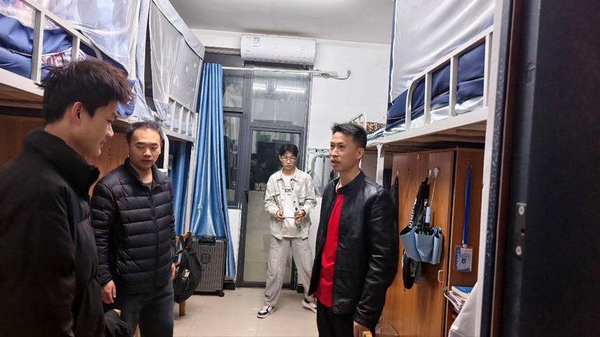 走访过程中,阮若林院长一行逐间深入宿舍,重点排查大功率电器、管制刀具等安全隐患,细致检查宿舍电路、消防设施等情况,对个别宿舍存在的物品摆放杂乱等问题现场提出整改建议。同时,针对夜不归宿、抽烟酗酒等不良行为进行专项排查,强调宿舍安全是校园安全的重中之重,引导学生树立“安全第一”的思想意识。老师们还特别关注寝室成员间的相处情况,鼓励同学们互帮互助,营造和谐友爱的宿舍氛围。