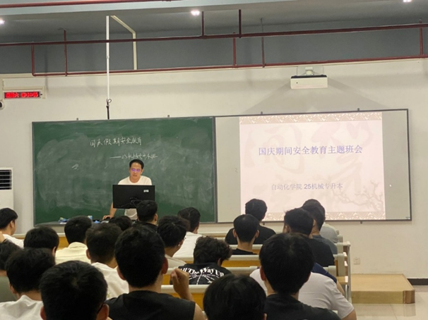自动化学院通过召开主题班会、严格落实值班制度、精准摸排学生动向等一系列举措,构筑了多维度的假期安全教育与管理体系,充分体现了学院对学生安全工作的高度重视,为国庆假期校园的平安稳定与学生的健康出行筑起了坚实屏障。(通讯员:闫东东、何柳秀 审稿:杨胜)